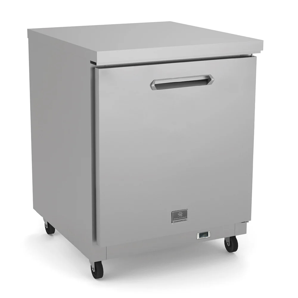 1-door refrigerator counter top with exterior back panel in aluminium, exterior bottom panel in galvanized steel, exterior side and top panel in 430 stainless steel; interior back, top and bottom panels in 304 stainless steel.
