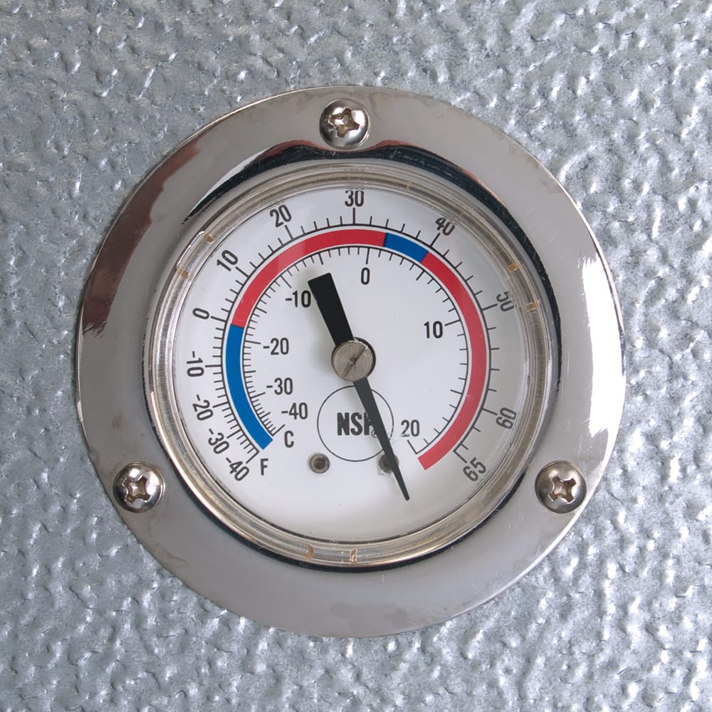 Made for indoor applications, the Kolpak P6-1010-FT Polar-Pak walk-in freezer operates at -10 degrees Fahrenheit with a dial thermometer that enables operators to monitor the temperature. Since the refrigeration system is on top, it is difficult for unauthorized personnel to access. Operators should account for additional height at the top of the walk-in cooler when measuring the kitchen.
