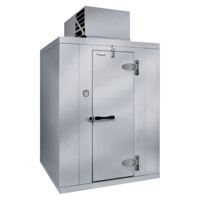 The Kolpak QS7-0612-CT-L Polar-Pak walk-in refrigerator has a refrigeration system that stacks on top of the unit, keeping the sides open for more equipment and storage, but typically requiring a 9-foot-tall ceiling. Because the system is indoors, it is safe from the elements and less stressed in summer months. This system maintains a temperature of 38 degrees Fahrenheit using fans that circulate cold air. The 2-inch dial thermometer enables the user to monitor the temperature.