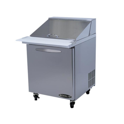 This prep table is designed for mobility, reliability & efficiency in commercial kitchens. The 27-inch Kool-It mega top sandwich prep table comes equipped with a removable, easy to clean 9.5” cutting board, 1” thick insulated lids and a coated evaporator coil. This prep station also features a refrigerated base with 7 cubic feet of storage space for keeping extra meat, vegetables, and fruit at food-safe temperatures prior to serving or adding to available food pans. The refrigerated base features a self-closing and stay-open feature, they seal tight with magnetic vinyl gasket and an accessible simple plug-in installation. A set of four high-quality 4-inch swivel casters with 2 front brakes are also pre-installed to help improve mobility. These industrial casters are designed to hold heavy weight and come with brakes on two of the wheels for added safety and control.