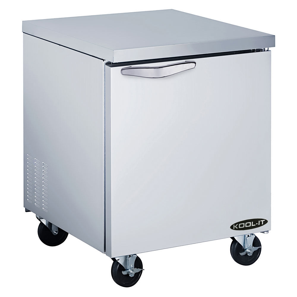 This undercounter freezer is designed for mobility, reliability & efficiency in commercial kitchens. The 27-inch Kool-It undercounter freezer comes equipped with 2 height adjustable, heavy-duty, PE coated wire shelves per door, and spring-loaded, self-closing doors. This undercounter freezer features a refrigerated base with 7 cubic feet of storage space for keeping extra meat, vegetables, and fruit at food-safe temperatures prior to serving or adding to available food pans. The freezer base features a self-closing and stay-open feature, they seal tight with magnetic vinyl gasket and an accessible simple plug-in installation. A set of four high-quality 4-inch swivel casters with 2 front brakes are also pre-installed to help improve mobility. These industrial casters are designed to hold heavy weight and come with brakes on two of the wheels for added safety and control.