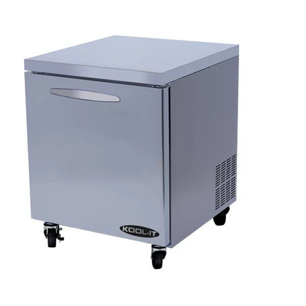 This undercounter refrigerator is designed for mobility, reliability & efficiency in commercial kitchens. The 27-inch Kool-It undercounter refrigerator comes equipped with 2 height adjustable, heavy-duty, PE coated wire shelves per door, and spring loaded, self-closing doors. This undercounter refrigerator features a refrigerated base with 7 cubic feet of storage space for keeping extra meat, vegetables, and fruit at food safe temperatures prior to serving or adding to available food pans. The refrigerated base features a self-closing and stay open feature, they seal tight with magnetic vinyl gasket and an accessible simple plug-in installation. A set of four high quality 4-inch swivel casters with 2 front brakes are also pre-installed to help improve mobility. These industrial casters are designed to hold heavy weight and come with brakes on two of the wheels for added safety and control.
