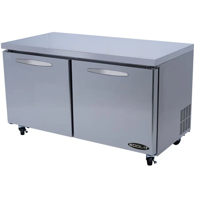 This undercounter freezer is designed for mobility, reliability & efficiency in commercial kitchens. The 60-inch Kool-It undercounter freezer comes equipped with 2 height adjustable, heavy-duty, PE coated wire shelves per door, and spring-loaded, self-closing doors. This undercounter freezer features a refrigerated base with 16.7 cubic feet of storage space for keeping extra meat, vegetables, and fruit at food-safe temperatures prior to serving or adding to available food pans. The freezer base features a self-closing and stay-open feature, they seal tight with magnetic vinyl gasket and an accessible simple plug-in installation. A set of four high quality 4-inch swivel casters with 2 front brakes are also pre-installed to help improve mobility. These industrial casters are designed to hold heavy weight and come with brakes on two of the wheels for added safety and control.