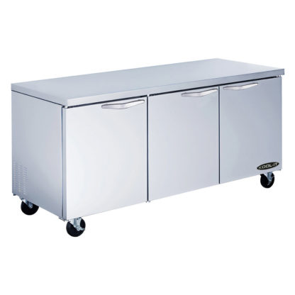 This undercounter refrigerator is designed for mobility, reliability & efficiency in commercial kitchens. The 72-inch Kool-It undercounter refrigerator comes equipped with 2 height adjustable, heavy-duty, PE coated wire shelves per door, and spring loaded, self-closing doors. This undercounter refrigerator features a refrigerated base with 20.2 cubic feet of storage space for keeping extra meat, vegetables, and fruit at food safe temperatures prior to serving or adding to available food pans. The refrigerated base features a self-closing and stay-open feature, they seal tight with magnetic vinyl gasket and an accessible simple plug-in installation. A set of four high-quality 4-inch swivel casters with 2 front brakes are also pre-installed to help improve mobility. These industrial casters are designed to hold heavy weight and come with brakes on two of the wheels for added safety and control.
