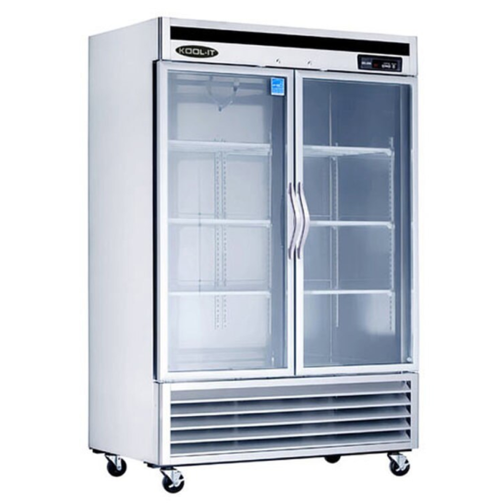 Add cold food storage space to your commercial kitchen or storeroom with the Kool-It 44.7 Cu. Ft. Double Glass Door Reach-In Refrigerator (KBSR-2G). The spacious cabinet features a solid, Stainless Steel Interior and exterior that works together with a polyurethane insulated body to maintain temperatures and food safety standards. Multiple shelves stand ready and are height-adjustable to make room for products of any size, while interior lights illuminate the space for easy storage and retrieval. This unit features a bottom-mount compressor, which elevates the storage space and provides easier access to maintenance.