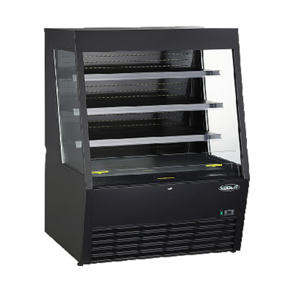 Kool-It Refrigerated Display Case, 15.7 cu. ft., 47.4″W x 32″D x 57.4″H, self-service/open front, 35° to 40°F temperature range, electronic thermostat with digital display, white interior with (3) adjustable shelves, LED lighting, night curtain, automatic defrost, powder coated black enamel interior & exterior, bottom mount self-contained refrigeration, (4) 2″ caster, 3/4 HP, R-290 refrigerant, 115v/60/1-ph, 13 amps, cord with NEMA 5-20P, cETLus, ETL-Sanitation