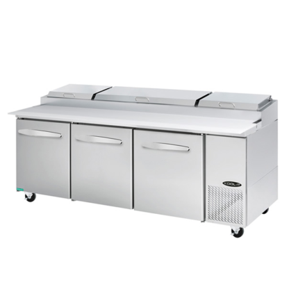This pizza prep table is designed for mobility, reliability & efficiency in commercial kitchens. The 93-inch pizza prep table comes equipped with a removable, easy to clean 18.9” cutting board, 1” thick insulated lids and a coated evaporator coil. This prep station also features a refrigerated base with 30.8 cubic feet of storage space for keeping extra meat, vegetables, and fruit at food safe temperatures prior to serving or adding to available food pans. The refrigerated base features a self-closing and stay-open feature, they seal tight with magnetic vinyl gasket and an accessible simple plug-in installation. A set of four high-quality 4-inch swivel casters with 2 front brakes are also pre-installed to help improve mobility. These industrial casters are designed to hold heavy weight and come with brakes on two of the wheels for added safety and control.