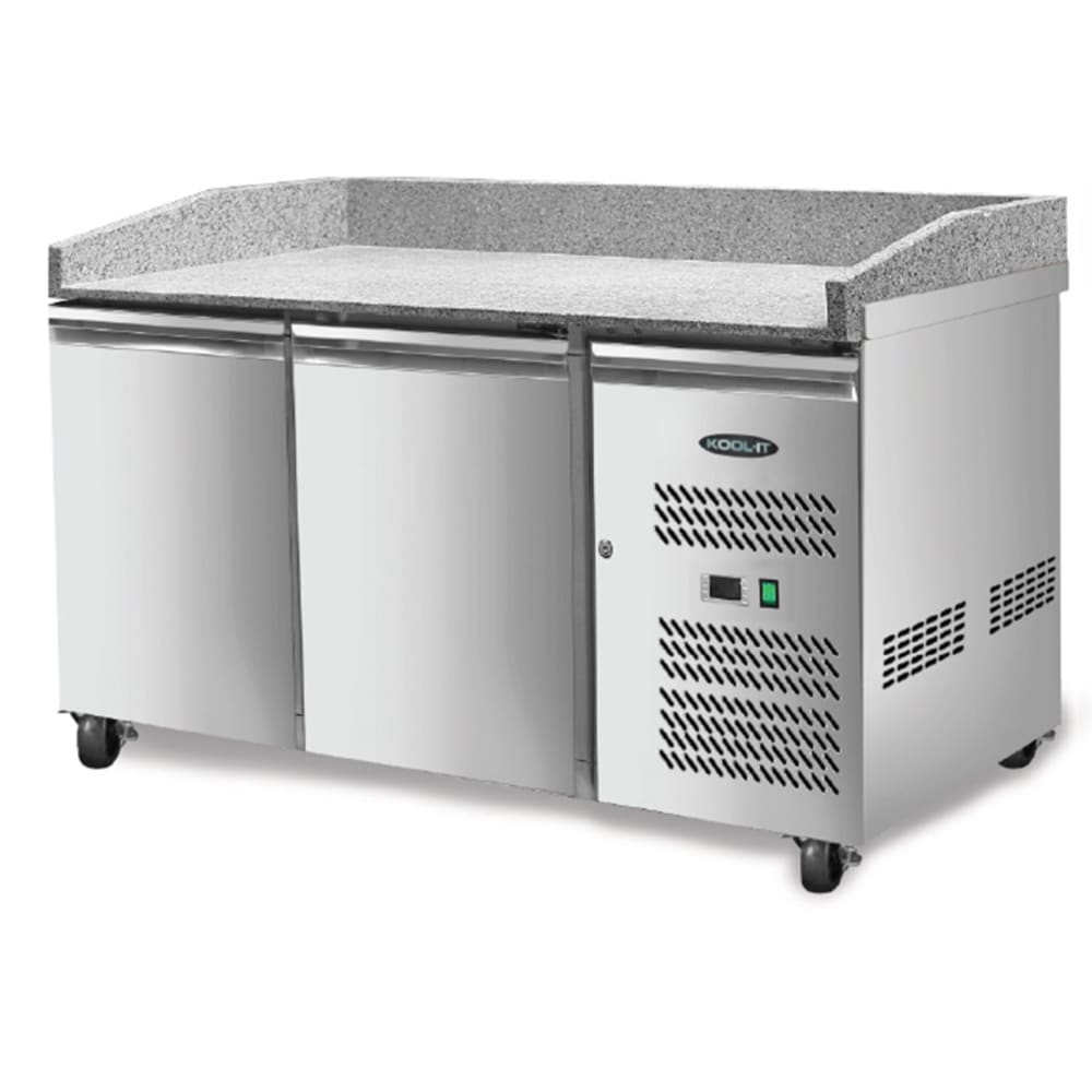 Kool-It Pizza Prep Table, two-section, 20.5 cu. ft. capacity, 79.7″W x 31-1/2″D x 39″, 35-42°F temperature range, (2) solid hinged door, (4) adjustable shelves, stainless steel interior & exterior, (4) swivel casters (2 braked), automatic defrost, side mounted self-contained refrigeration, R290 refrigerant, 115v/60/1-ph, 4.3 amps, cord, NEMA 5-15P, cETLus, ETL-Sanitation