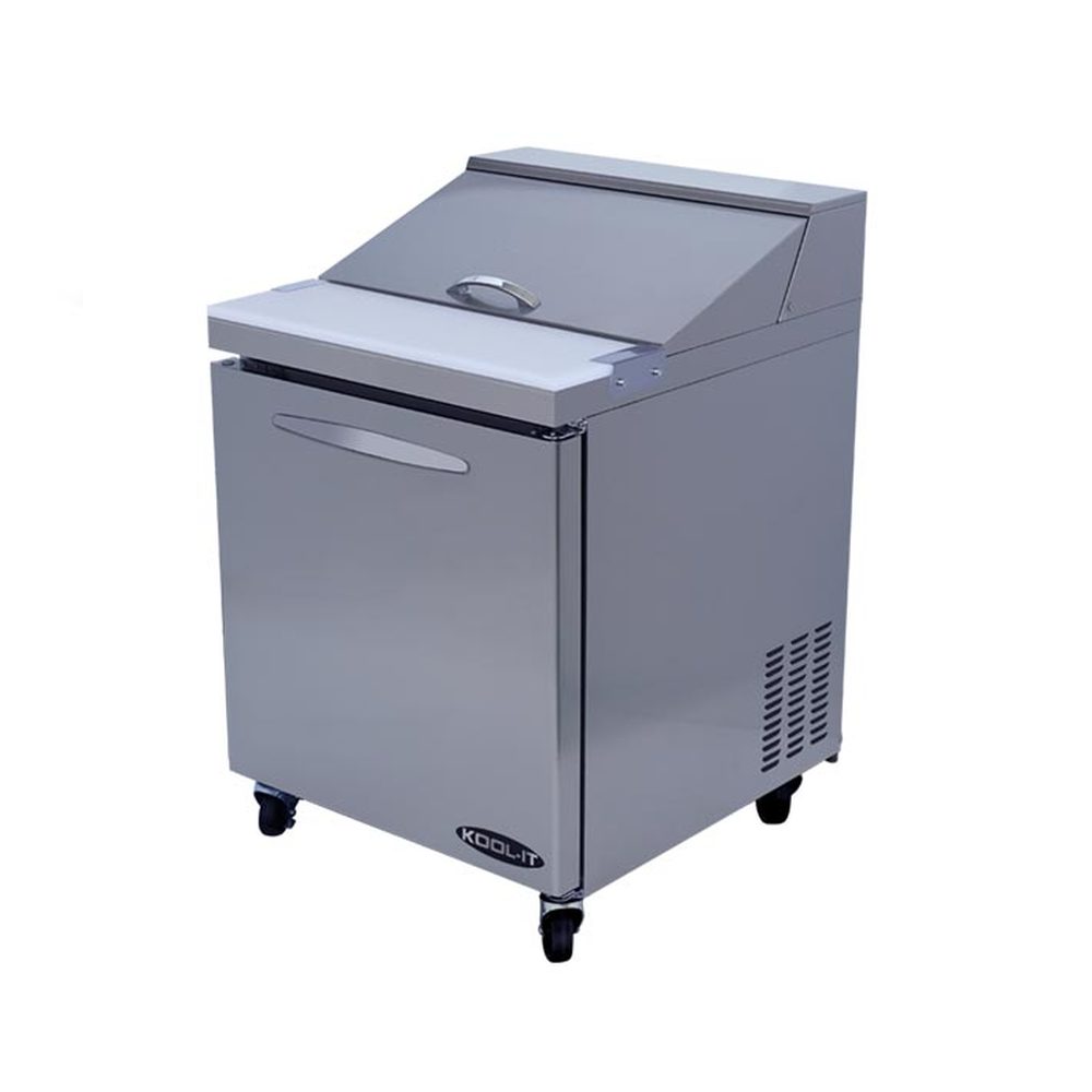 This prep table is designed for mobility, reliability & efficiency in commercial kitchens. The 27-inch Kool-It sandwich prep table comes equipped with a removable, easy to clean 9.5” cutting board, 1” thick insulated lids and a coated evaporator coil. This prep station also features a refrigerated base with 7 cubic feet of storage space for keeping extra meat, vegetables, and fruit at food-safe temperatures prior to serving or adding to available food pans. The refrigerated base features a self-closing and stay-open feature, they seal tight with magnetic vinyl gasket and an accessible simple plug-in installation. A set of four high-quality 4-inch swivel casters with 2 front brakes are also pre-installed to help improve mobility. These industrial casters are designed to hold heavyweight and come with brakes on two of the wheels for added safety and control.