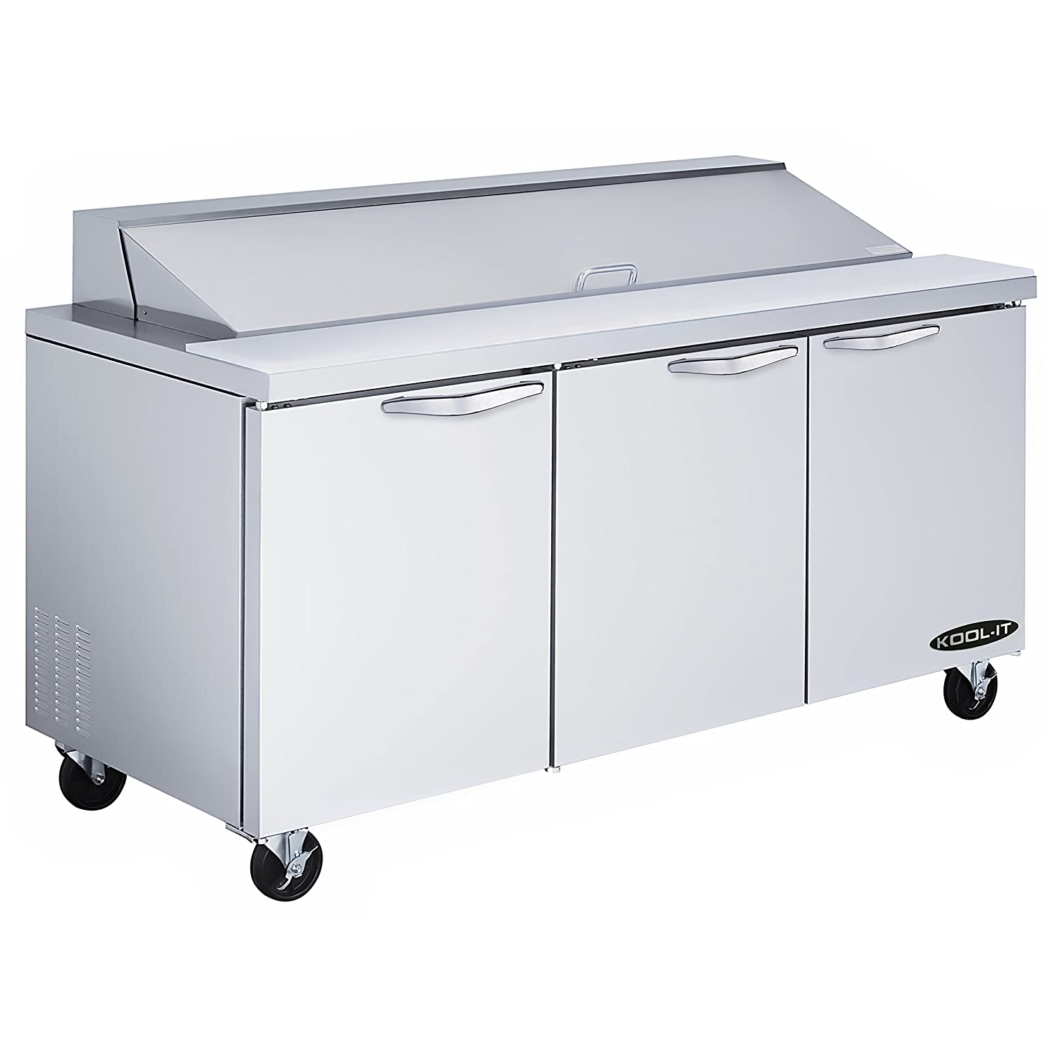 This prep table is designed for mobility, reliability & efficiency in commercial kitchens. The 72-inch Kool-It sandwich prep table comes equipped with a removable, easy to clean 9.5” cutting board, 1” thick insulated lids and a coated evaporator coil. This prep station also features a refrigerated base with 20.2 cubic feet of storage space for keeping extra meat, vegetables, and fruit at food-safe temperatures prior to serving or adding to available food pans. The refrigerated base features a self-closing and stay-open feature, they seal tight with magnetic vinyl gasket and an accessible simple plug-in installation. A set of four high-quality 4-inch swivel casters with 2 front brakes are also pre-installed to help improve mobility. These industrial casters are designed to hold heavy weight and come with brakes on two of the wheels for added safety and control.