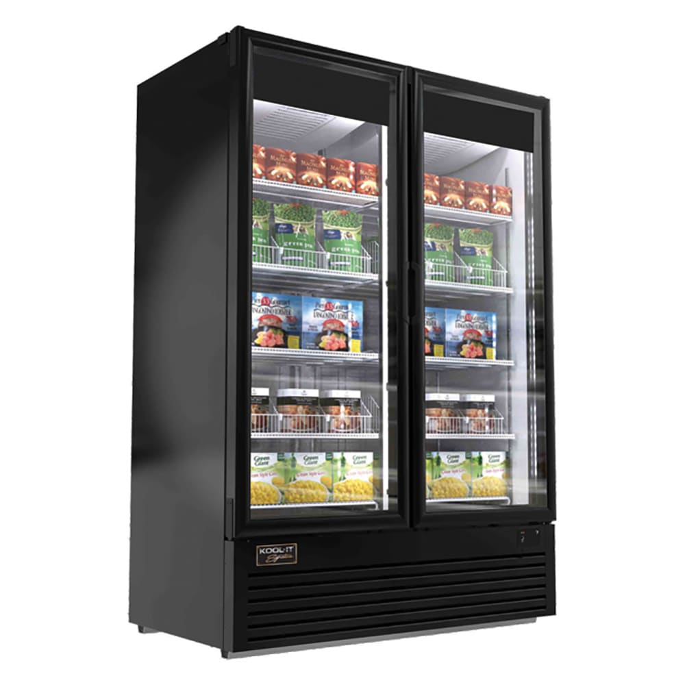 Kool-It Signature Merchandiser Freezer, two-sections, 42.97 cu-ft capacity, 54-3/10″W x 31-3/10″D x 78-9/10″H, (2) triple pane glass door hinged right, white pre-painted steel interior with (8) shelves & LED lighting, black pre-painted steel exterior, bottom mounted self-contained refrigeration, eco-friendly R290 refrigerant, 1/2 HP, 115v/60/1-ph, 11.2 amps, cord with NEMA 5-15P