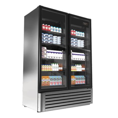 Kool-It Signature Merchandiser Freezer, two-sections, 42.97 cu-ft capacity, 54-3/10″W x 31-3/10″D x 78-9/10″H, (2) triple pane glass door hinged right, 201 stainless steel interior with (8) shelves & LED lighting, 430 stainless steel exterior, bottom mounted self-contained refrigeration, eco-friendly R290 refrigerant, 1/2 HP, 115v/60/1-ph, 11.2 amps, cord with NEMA 5-15P