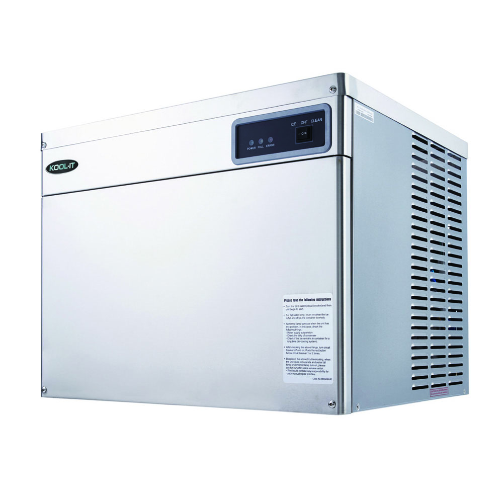 Producing up to 446 pounds of ice a day, the Kool-It Modular Ice Maker is perfect for large restaurants, cafeterias, or bakeries. This Modular Ice Maker is created to endure the everyday use of your commercial environment. Its attractive stainless steel exterior is composed of high-quality construction to ensure reliability, longevity, and product durability. This energy-efficient unit incorporates an improved evaporator freezing surface allowing for increased production and lower operating costs. This Kool-It Ice maker was designed for efficiency and dependability. It includes an internal safety switch to monitor and protect the refrigeration system along with a control board for onboard self-diagnostics.