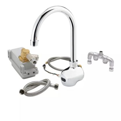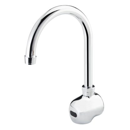 Electronic with infrared sensors, the Krowne 16-191 touchless faucet detects hands in the sink bowl, automatically turning water on and off. This touchless design promotes hygiene and sanitation around the sink by limiting hand contact. It has a tall, 6-inch gooseneck spout and is designed to be mounted on the backsplash behind the sink bowl. A mixing valve is included to let users adjust the water temperature. Designed with check valves, this faucet prevents backflow to ensure the water supply isn’t contaminated.
