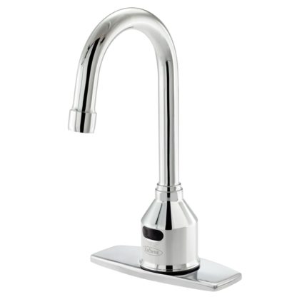 Krowne Royal Series Electronic Faucet, deck mount, single hole, 4-1/2″ rigid gooseneck spout, deck plate, NSF, CSA, MA, LA, CEC, operates on battery (4 AA alkaline 1.5V batteries) or power supply (battery included)