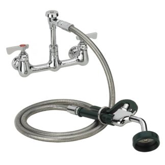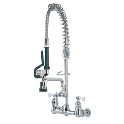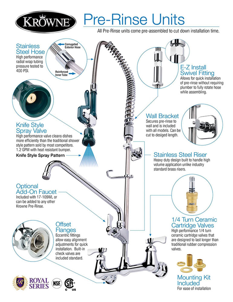 Krowne Royal Series Space Saver Pre-Rinse Assembly, with add-on faucet, wall mount, 8″ centers, spring action flexible gooseneck, 22-1/2″H stainless steel hose with 8″ overhang & 1.2 GPM spray head, 8″ riser, built in check valves, 2.0 GPM add-on faucet with 6″ swing spout, includes wall bracket & mounting kit, chrome plated brass base, low lead compliant, includes internal check valves to prevent backflow and cross contamination, NSF