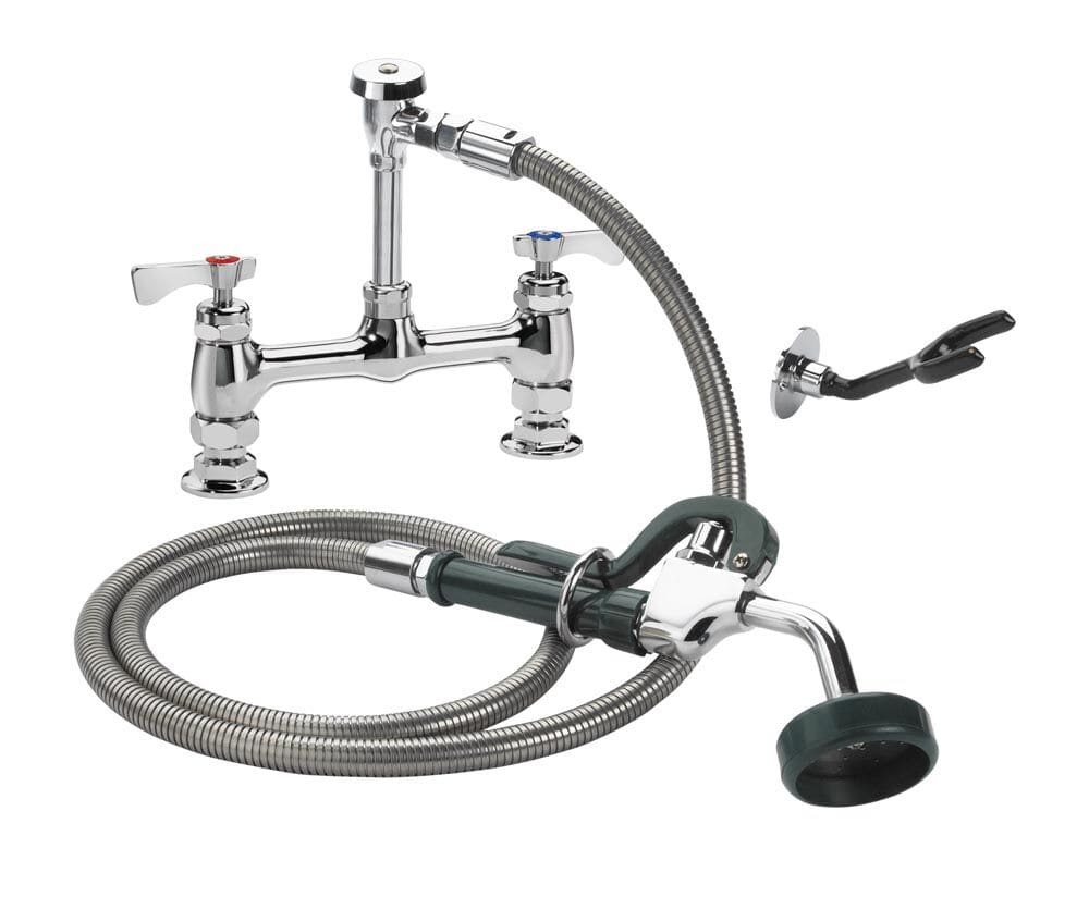 Krowne Royal Series Utility Spray Assembly, deck mount, 8″ adjustable centers, 72″ long stainless steel flexible hose, plastic coated wall hook, vacuum breaker, 1/2″ NPT male inlets, mounting kit included, built in check valves, low lead compliant, NSF