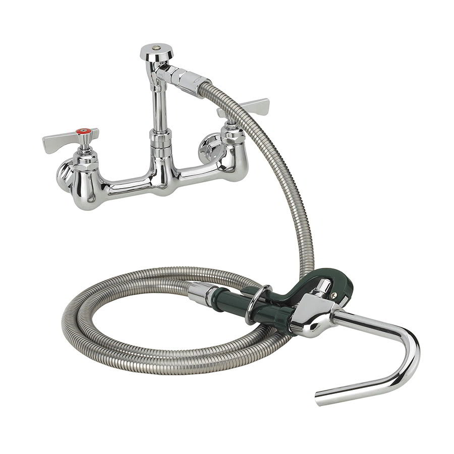 Krowne Royal Series Pot Filler Assembly, wall mount, 8″ adjustable centers, 72″ long stainless steel flexible hose with pot hook valve, plastic coated wall hook, vacuum breaker, 1/2″ NPT female inlets, mounting kit included, built in check valves, includes internal check valves to prevent backflow and cross contamination, low lead compliant