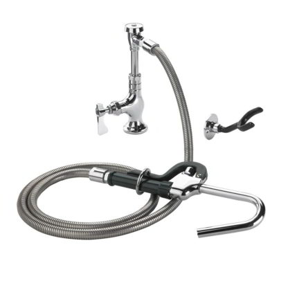 Krowne Royal Series Pot Filler Assembly, deck mount, single pantry, 72″ long stainless steel flexible hose with pot hook valve, plastic coated wall hook, vacuum breaker, 1/4″ NPT male inlet, mounting kit included, built in check valves, includes internal check valves to prevent backflow and cross contamination, low lead compliant