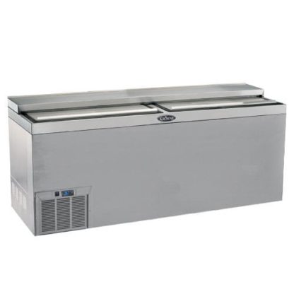 Bottle Cooler, flat top, 72″W x 24″D x 34″H, self-contained refrigeration, (25.5) cases/12oz bottles capacity, (2) sliding lids, (4) adjustable chrome plated divider racks, stainless steel interior, stainless steel exterior front & sides, condensate evaporator, 1/3 HP, 8′ cord & NEMA 5-15P, 6.0 amps, 115v/60hz/1-ph, ETL