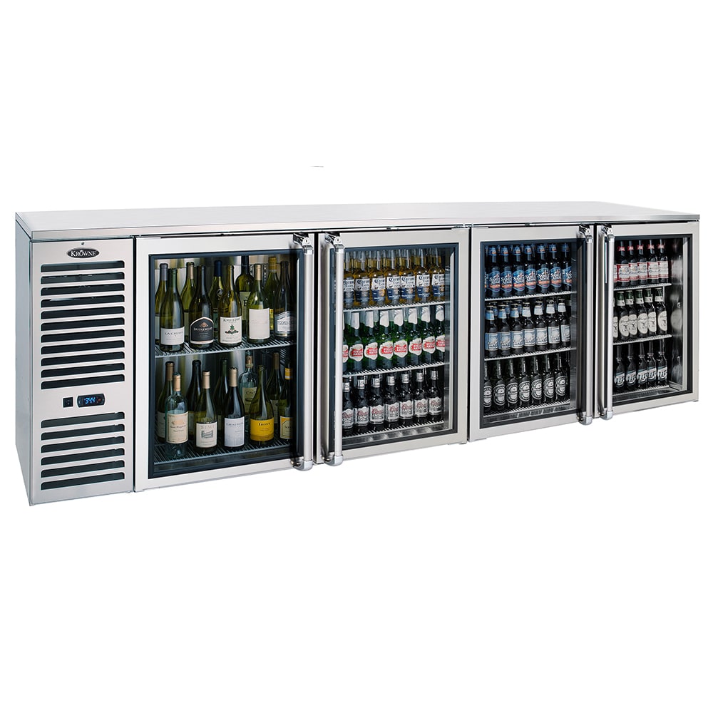 To keep drinks organized, the Krowne BS108L-KSS bar back refrigerator has two wire shelves and one floor rack per section, and because the shelves are adjustable, users can store many types of beverage containers, from cans of soda to jugs of juice and milk. Each of the four doors are made of glass to provide users with a clear view of the case’s contents, and they have locks so users can keep valuable products safe from theft. To reinforce the doors against tampering, they have stainless steel frames.