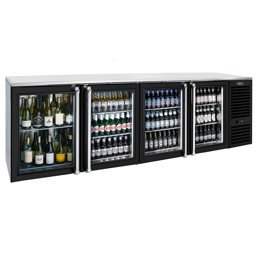 Refrigerated Back Bar Storage Cabinet, four-section, 108″W x 24″D, side mounted self-contained refrigeration, 30°F to 40°F temperature range, right compressor, glass door w/ black vinyl, stainless steel top, stainless steel cabinet sides, (4) hinged doors with locks, (2) adjustable shelves & floor rack per door, digital thermostat, LED interior lights, includes condensate evaporator pan, stainless steel interior, R134a, 1/3 HP, 115v/60/1-ph, 6.5 amps, cord with NEMA 5-15P, ETL-Sanitation, ETLus