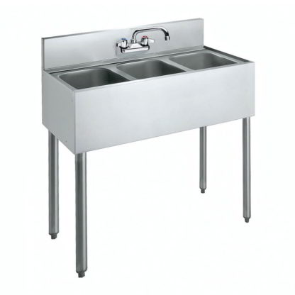 Convenience Store Sink, three compartment, 36″W x 19″D x 42-1/2″H, 6-1/2″H backsplash, 10″ wide x 14″ front-to-back x 10″ deep compartments, 4″ OC splash mount faucet with swing spout (low lead compliant), apron on front & sides, includes (3) 3-1/2″ basket drains, stainless steel construction, stainless steel legs with adjustable plastic bullet feet, NSF