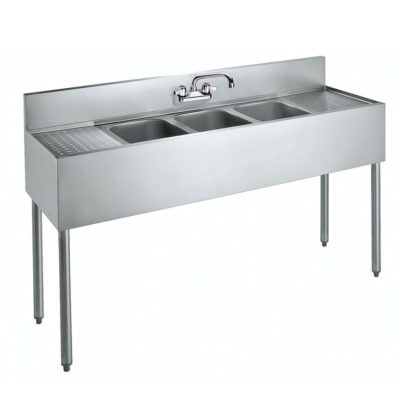 Convenience Store Sink, three compartment, 72″W x 19″D x 42-1/2″H, 6-1/2″H backsplash, 10″ wide x 14″ front-to-back x 10″ deep compartments, 18″ drainboards on left & right, 4″ OC splash mount faucet with swing spout (low lead compliant), apron on front & sides, includes (3) 3-1/2″ basket drains, stainless steel construction, stainless steel legs with adjustable plastic bullet feet, NSF