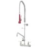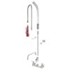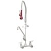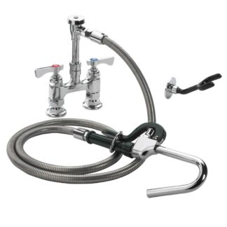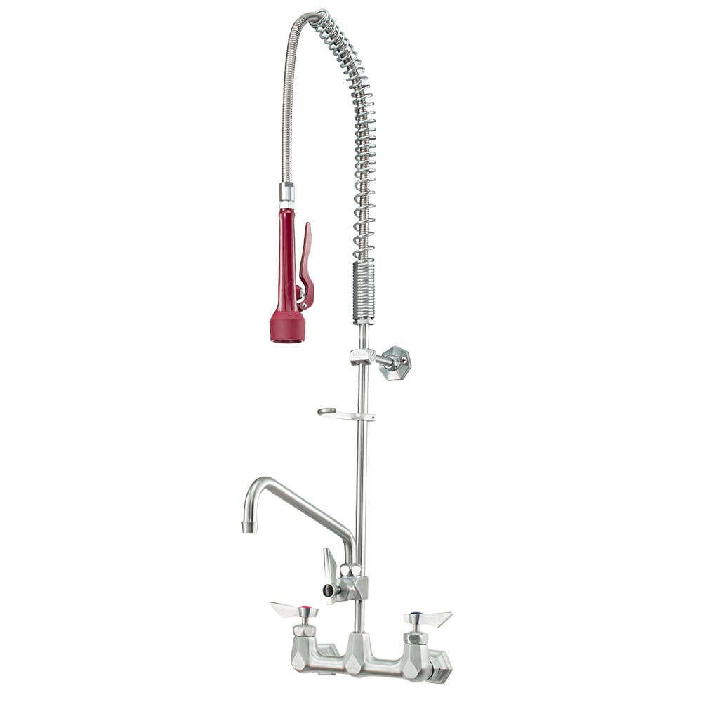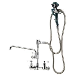 Diamond Series 8″ Center Wall Mount Pre-Rinse with add on Faucet (12″ Swing Spout), 8″ centers, lever handles, 1/2″ NPT female inlet, 1/4 turn high performance ceramic cartridge valves with integral check, 44″ hose with grip, 1.15 GPM