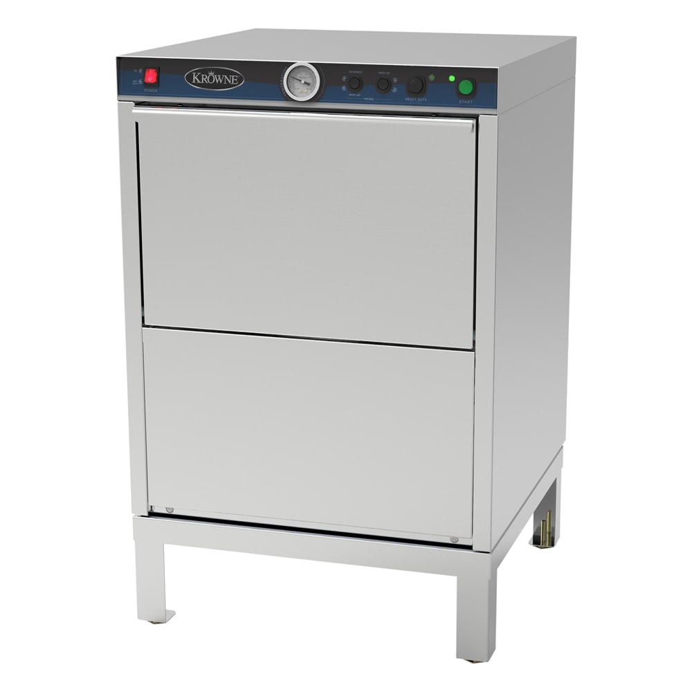 The Krowne GWD-24 undercounter glass washer has built-in detergent, rinse-aid, and sanitizing pumps that ensure glasses are properly sanitized. This unit can wash (30) 20-inch by 20-inch racks per hour and completes a full cycle every 90 seconds. A thermostatically controlled wash tank heater ensures that water stays at the required temperature. The Krowne GWD-24 low-temperature glasswasher accommodates 11-inch-tall stemware and uses only 1.64 gallons of water per rack