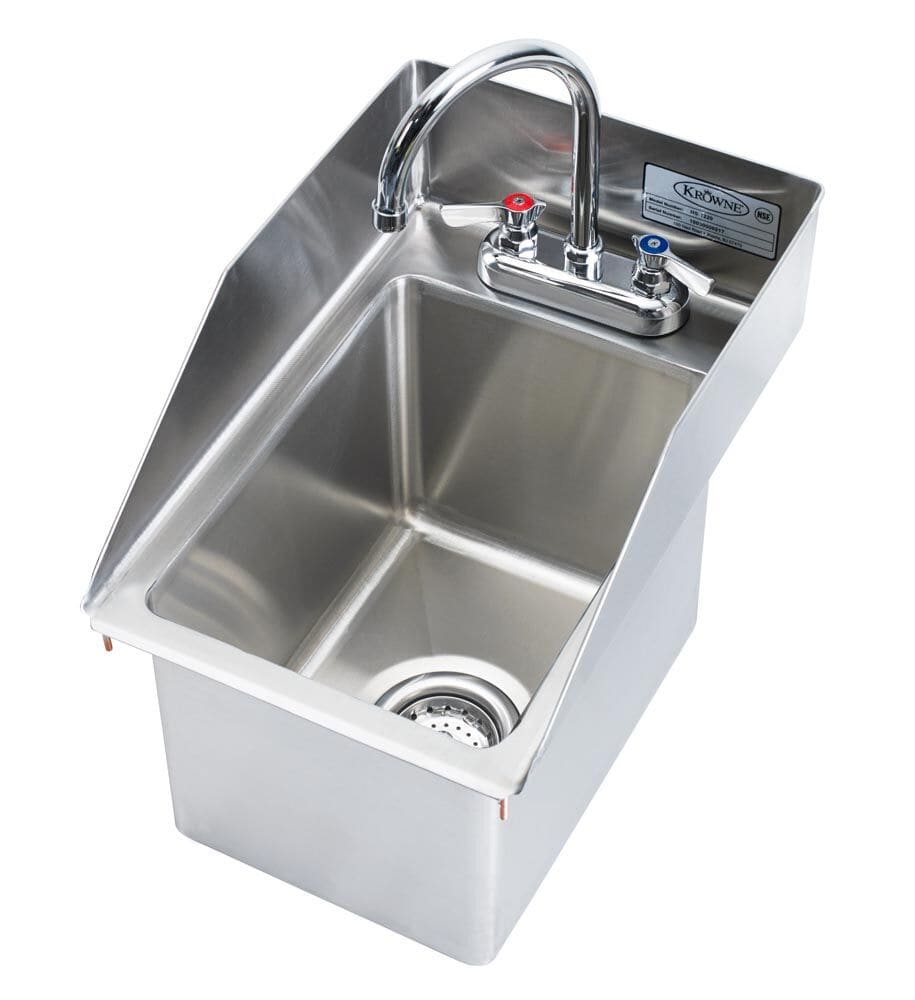 The Krowne HS-1220 drop-in hand sink is excellent for back bar areas, back-of-house applications, and even small cafés. A gooseneck faucet and 31/2-inch-diameter drain are included. To prevent messes, this unit has 51/2-inch-tall side and rear splashes. Its deep-drawn bowl, TIG-welded seams, and rust-resistant stainless steel construction provide strength for long-term use.