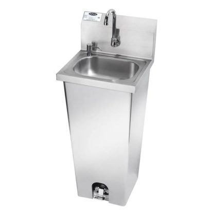 Hand Sink, pedestal mount, 15-3/4″W x 15-1/4″D x 41-1/4″H O.A., 8″H backsplash, 12-1/2″ wide x 9-3/4″ front-to-back x 6″ deep bowl, splash mount gooseneck faucet with foot pedal valve (low lead compliant), soap dispenser included, includes mounting bracket, stainless steel construction, NSF