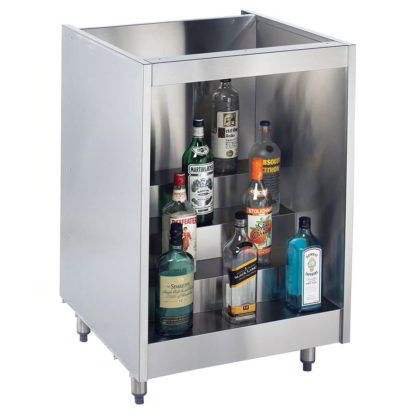 Back Bar Liquor Display, 18″W x 24″D, no top, (4) steps, galvanized steel back, stainless steel interior & exterior sides
