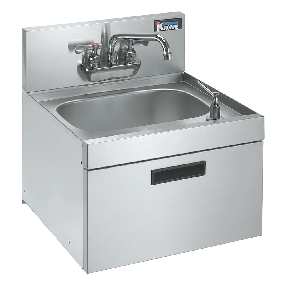 The Krowne KR19-18WST hand sink has a built-in soap and towel dispenser to provide a convenient hand washing station. The faucet is splash mounted on the unit’s backsplash, which prevents soap and water from splattering on the wall. This unit is intended for wall mounting, so it can be installed in a restroom or kitchen for customers or employees to wash their hands.