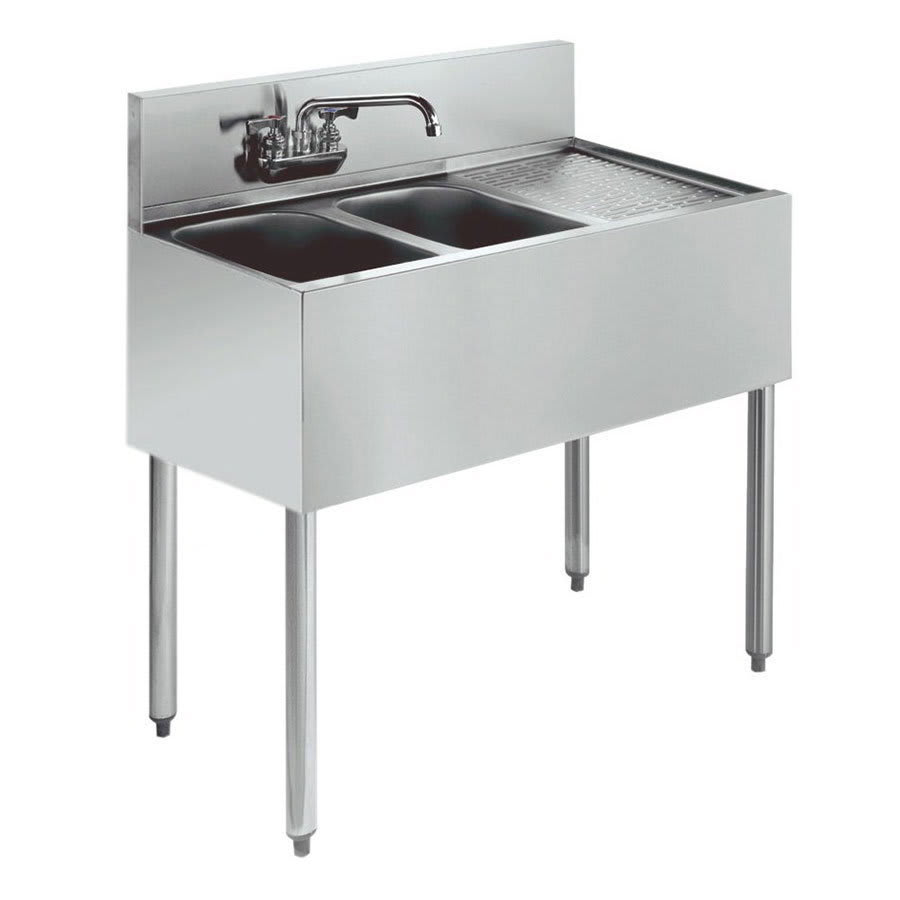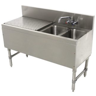 Royal Series Underbar Sink Unit, two compartment, 36″W x 19″D, 10″ wide x 14″ front-to-back x 10″ deep compartments, 12″ embossed drainboard on right, splash mount Royal Series faucet with swing spout (low lead compliant), apron on front & sides, (2) removable overflow standpipes, stainless steel top, front, & sides, stainless steel legs with adjustable thermoplastic bullet feet, NSF