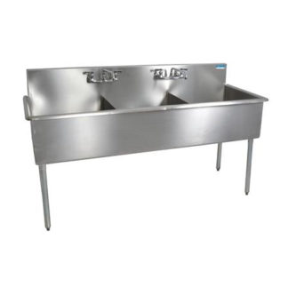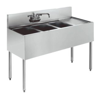 Royal Series Underbar Sink Unit, three compartment, 36″W x 19″D, 10″ wide x 14″ front-to-back x 10″ deep compartments, splash mount Royal Series faucet with swing spout, apron on front & sides, (3) removable overflow standpipes, stainless steel top, front, & sides, stainless steel legs with adjustable thermoplastic bullet feet, NSF