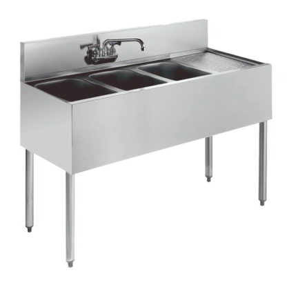 Royal Series Underbar Sink Unit, three compartment, 48″W x 19″D, 10″ wide x 14″ front-to-back x 10″ deep compartments, 12″ embossed drainboard on right, splash mount Royal Series faucet with swing spout (low lead compliant), apron on front & sides, (3) removable overflow standpipes, stainless steel top, front, & sides, stainless steel legs with adjustable thermoplastic bullet feet, NSF