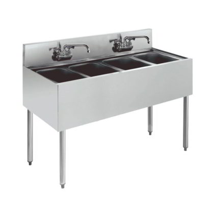 Royal Series Underbar Sink Unit, four compartment, 48″W x 19″D, 10″ wide x 14″ front-to-back x 10″ deep compartments, splash mount Royal Series faucet with double jointed spout, apron on front & sides, (4) removable overflow standpipes, stainless steel top, front, & sides, stainless steel legs with adjustable thermoplastic bullet feet, NSF