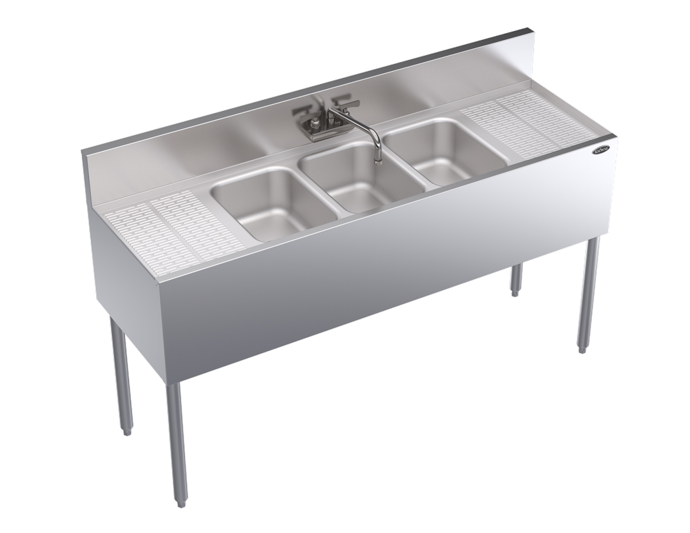 An alternative to a dishwasher, the Krowne KR19-53C three-compartment sink has separate compartments for washing, rinsing, and sanitizing. Each end has a 12-inch embossed drainboard, one for scrapping and one for air drying, while the faucet on the backsplash has a swing spout so it can reach into the different bowls. Made of stainless steel, the unit resists rusting, denting, and scratching. Adjustable on uneven floors, the legs’ feet are made of plastic.
