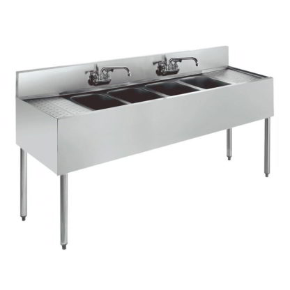 Royal Series Underbar Sink Unit, four compartment, 84″W x 19″D, 10″ wide x 14″ front-to-back x 10″ deep compartments, 18″ embossed drainboards on left & right, splash mount Royal Series faucet with double jointed spout, apron on front & sides, (4) removable overflow standpipes, stainless steel top, front, & sides, stainless steel legs with adjustable thermoplastic bullet feet, NSF