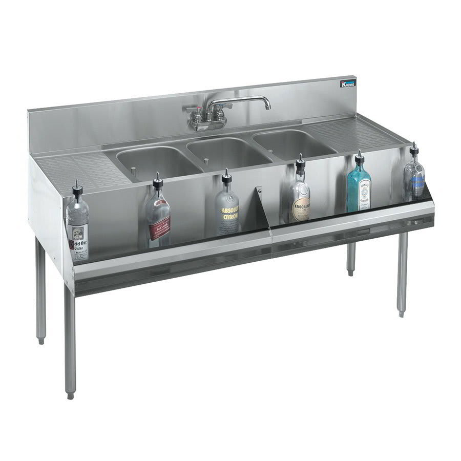 Royal Series Underbar Sink Unit, three compartment, 96″W x 19″D, 10″ wide x 14″ front-to-back x 10″ deep compartments, 30″ embossed drainboards on left & right, splash mount Royal Series faucet with swing spout, apron on front & sides, (3) removable overflow standpipes, stainless steel top, front, & sides, stainless steel legs with adjustable thermoplastic bullet feet, NSF