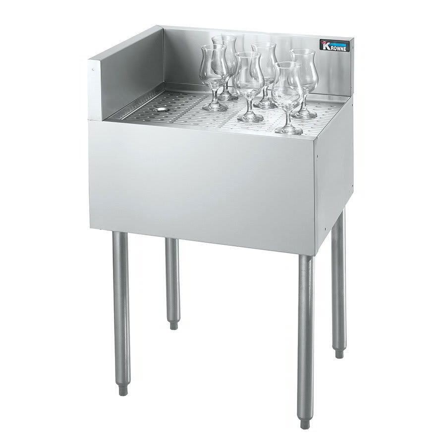 Royal Series Underbar Corner Drainboard, free standing, 18″W x 19″D x 36-1/2″H.O.A., left end return, embossed top with 1″ drain, stainless steel top, front, & sides, stainless steel legs with adjustable thermoplastic bullet feet, NSF