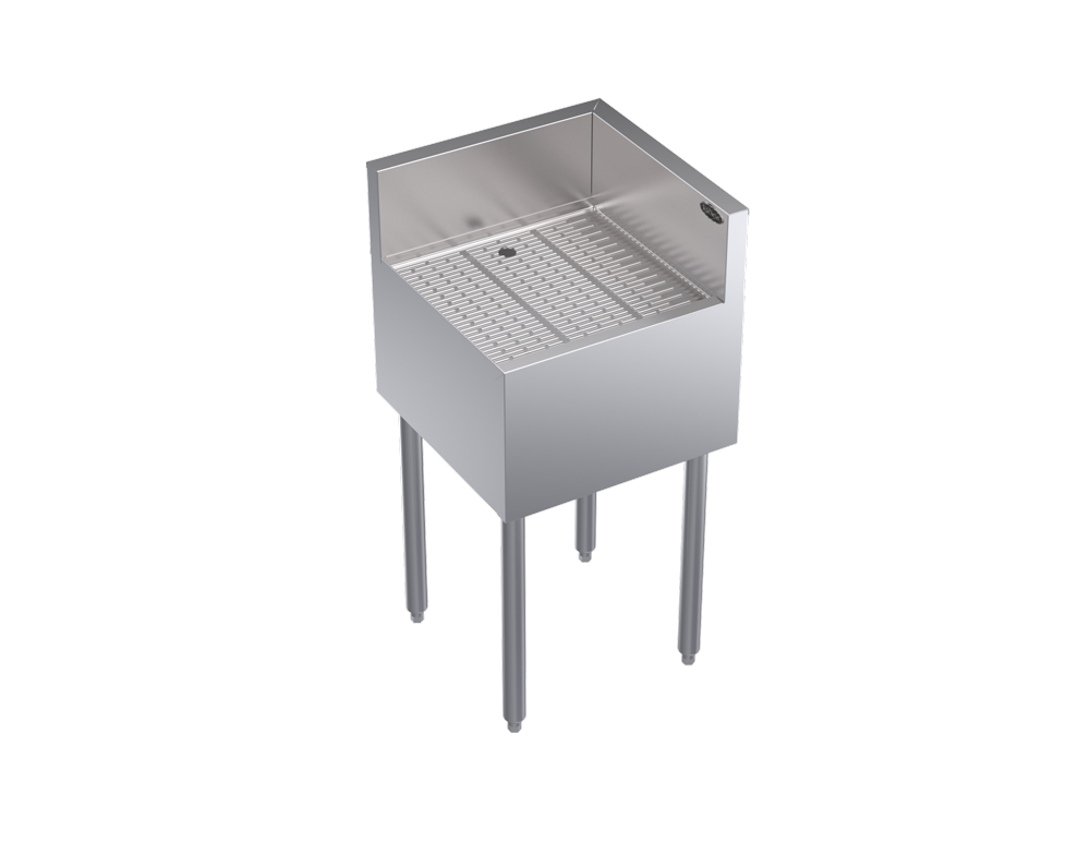 Royal Series Underbar Corner Drainboard, free standing, 18″W x 19″D x 36-1/2″H.O.A., right end return, embossed top with 1″ drain, stainless steel top, front, & sides, stainless steel legs with adjustable thermoplastic bullet feet, NSF