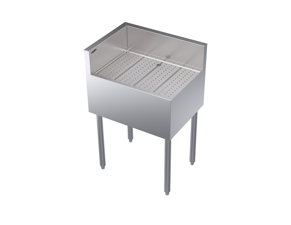 Royal Series Underbar Corner Drainboard, free standing, 24″W x 19″D x 36-1/2″H.O.A., left end return, embossed top with 1″ drain, stainless steel top, front, & sides, stainless steel legs with adjustable thermoplastic bullet feet, NSF