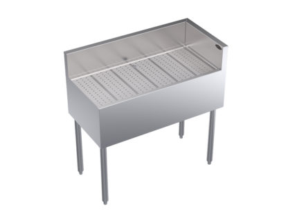 Royal Series Underbar Corner Drainboard, free standing, 36″W x 19″D x 36-1/2″H.O.A., right end return, embossed top with 1″ drain, stainless steel top, front, & sides, stainless steel legs with adjustable thermoplastic bullet feet, NSF