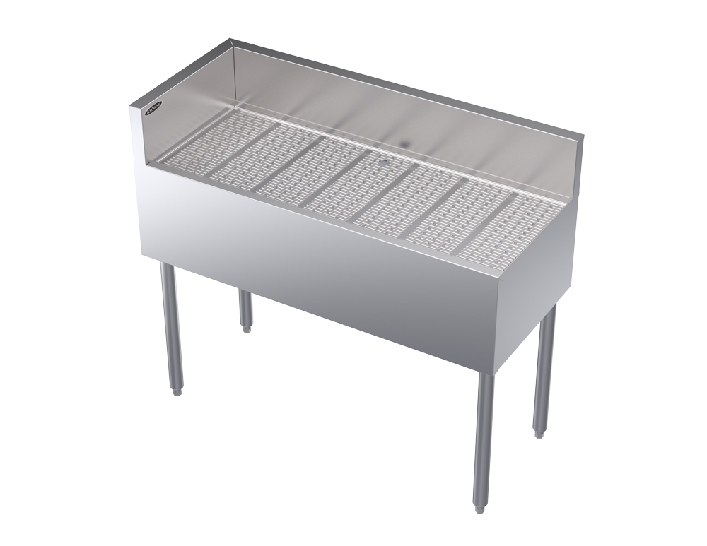 Royal Series Underbar Corner Drainboard, free standing, 42″W x 19″D x 36-1/2″H.O.A., left end return, embossed top with 1″ drain, stainless steel top, front, & sides, stainless steel legs with adjustable thermoplastic bullet feet, NSF