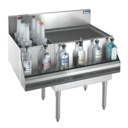 Royal Series Underbar Multi Station, ice bin with bottle well, 42″W x 19″D O.A., built-in 10-circuit cold plate, 30″W ice bin on right, 97 lbs. capacity, (1) 12″W insulated bottle storage with wire bottle racks unit on left, stainless steel top, front, & sides, stainless steel legs with adjustable thermoplastic bullet feet, NSF