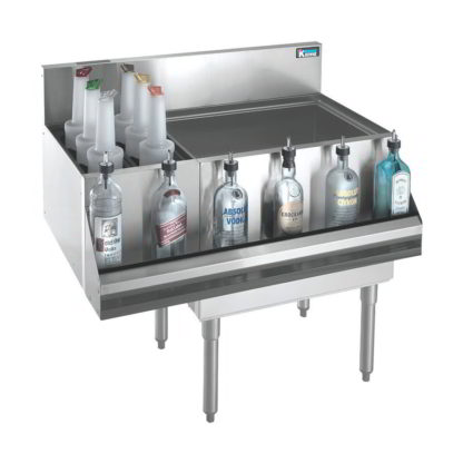 Royal Series Underbar Multi Station, ice bin with bottle well, 48″W x 19″D O.A., 24″W ice bin in center, 80 lbs. capacity, (2) 12″W insulated bottle storage with wire bottle racks units on each end, stainless steel top, front, & sides, stainless steel legs with adjustable thermoplastic bullet feet, NSF