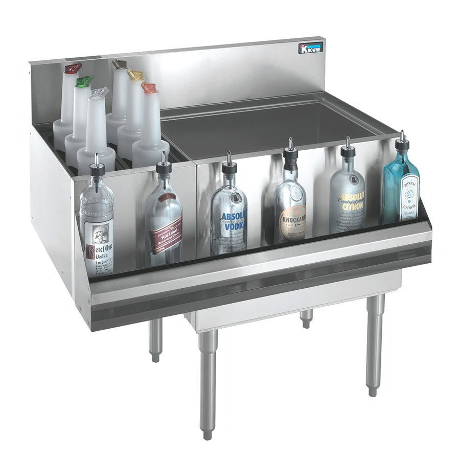 Royal Series Underbar Multi Station, ice bin with bottle well, 48″W x 19″D O.A., 36″W ice bin on right, 115 lbs. capacity, (1) 12″W insulated bottle storage with wire bottle racks unit on left, stainless steel top, front, & sides, stainless steel legs with adjustable thermoplastic bullet feet, NSF