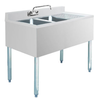 The dump sink on this underbar speed station has a wall mount Royal Series faucet with 1/4-turn ceramic cartridges included and the sink bowl is 10″ wide (side-to-side) x 14″ long (front-to-back), and 7″ deep with a 1 1/2″ center drain.